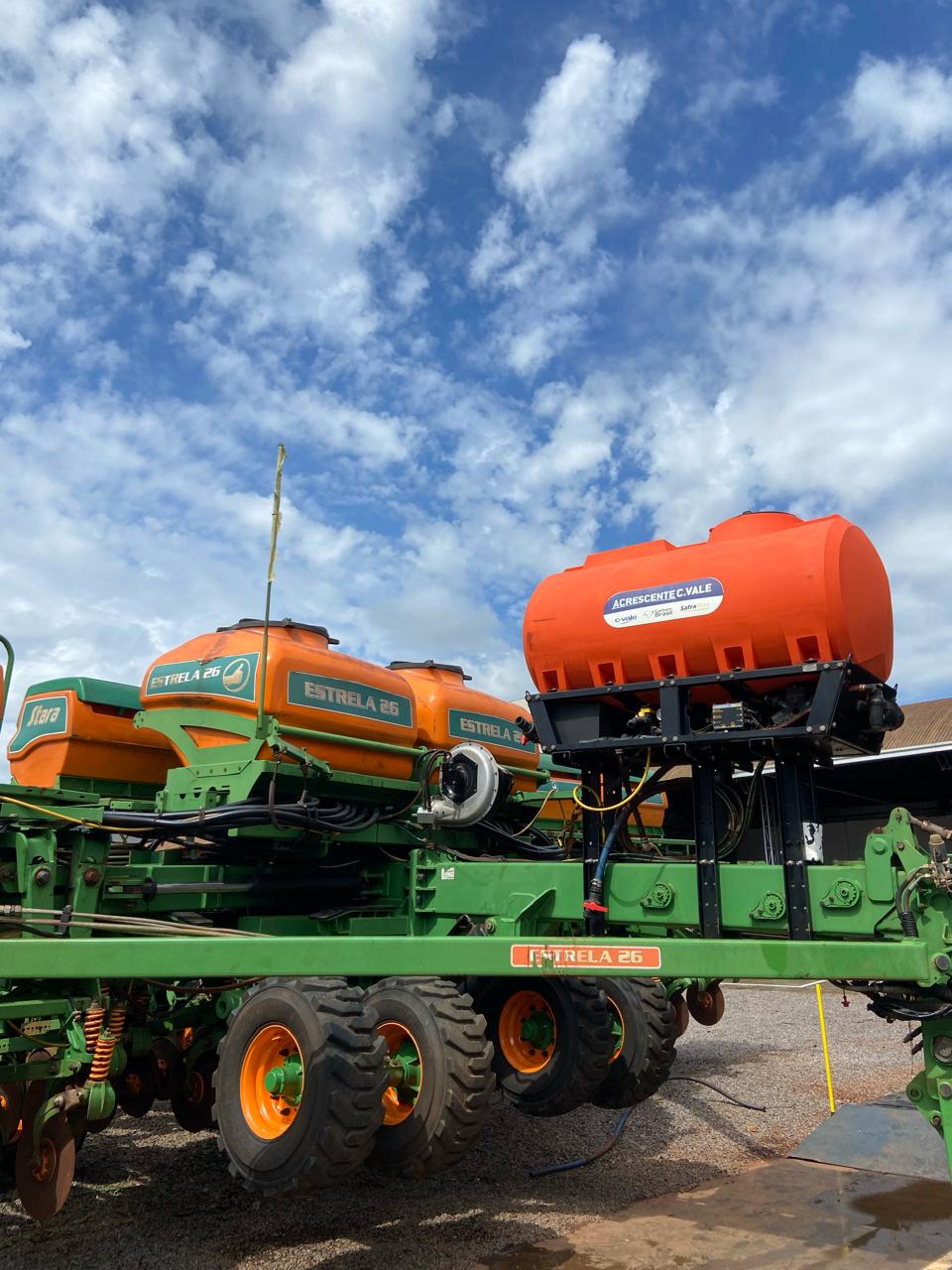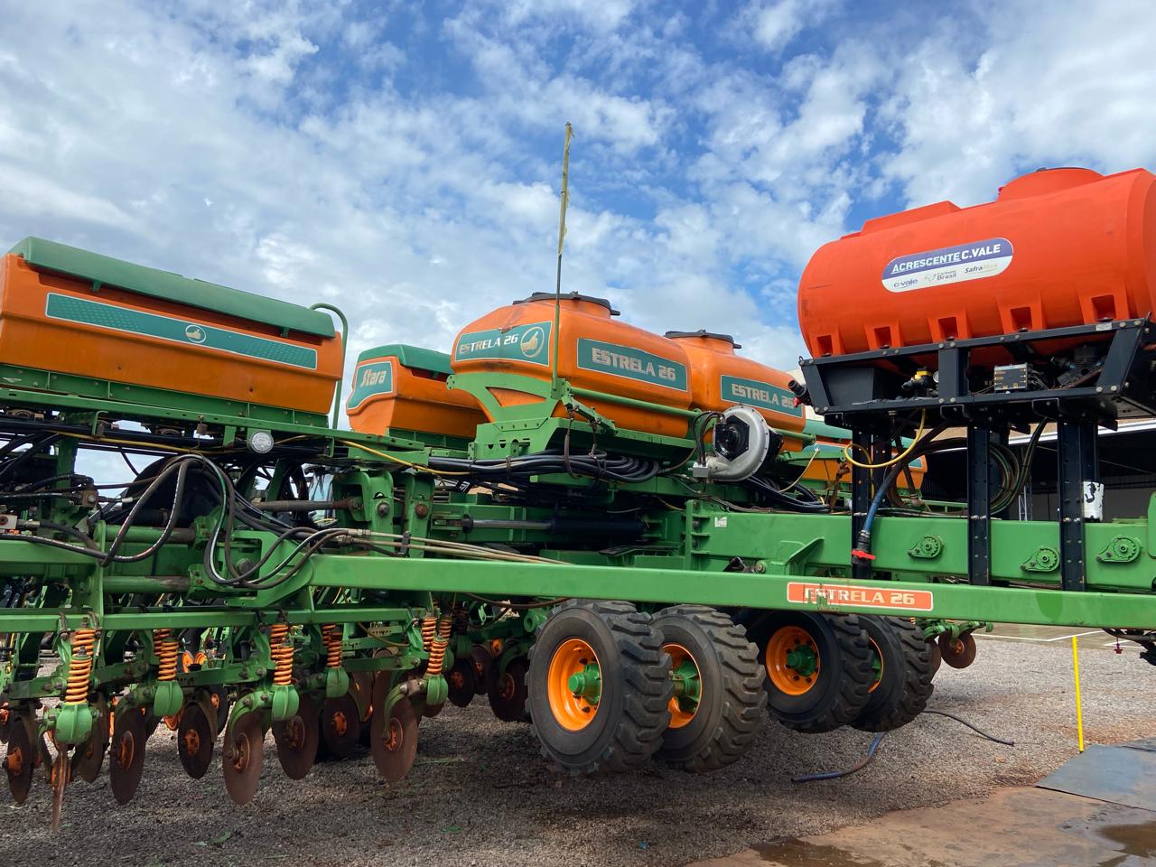 SEMEADORA DE ARRASTO, MODELO ESTRELA, TELA - C/ SISTEMA CONTROL C/ SHS E PENEUMATICO TRATOR, CHASSI 26, C/ 26 LINHAS, C/ ESPAÇAMENTO DE 45CM, DISCO DE CORTE DE 20", LINHAS DE ADUBO PIVOTADA, D.D. ADUBO DEF. 15.5X16" E FACAO. LINHAS DE SEM. PANT. C/ TRANS. CARDAN, D.D. SEM. DEF. 15.5X16', C/ SENSOR DE SEM. LIMIT. 80MM C/ BALANCIN E COMP. "V" E TOPPER 5500 MARCA STARA